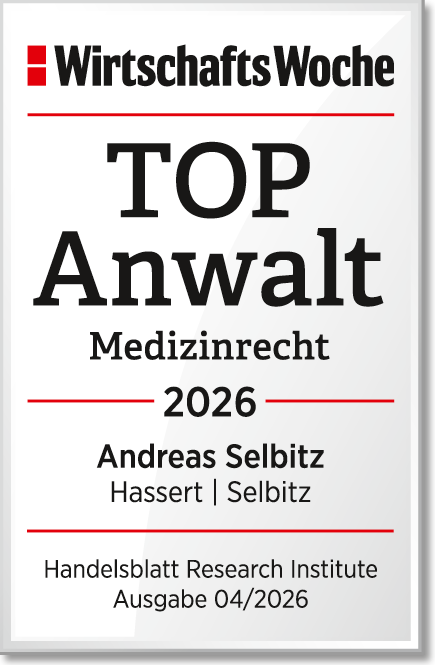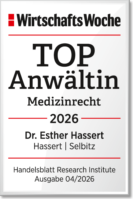 Unsere Sozietät wurde im Januar 2026 von der WirtschaftsWoche zum 7. Mal als TOP Kanzlei im Medizinrecht ausgezeichnet. Zudem werden Frau Dr. Esther Hassert als TOP Anwältin und Herr Andreas Selbitz als TOP Anwalt empfohlen. Grundlage der Auszeichnung ist eine umfangreiche Befragung des Handelsblatt Research Institute (HRI), bei der 860 Medizinrechtler aus 220 Kanzleien ihre renommiertesten Kollegen benannten. 32 Kanzleien mit 36 Anwälten für die Patientenseite konnten sich deutschlandweit hervorheben.